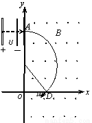 ÈçͼËùʾ£¬ÔÚyÖáµÄÓÒ²à´æÔڴŸÐӦǿ¶ÈΪBµÄ·½Ïò´¹Ö±Ö½ÃæÏòÍâµÄÔÈÇ¿´Å³¡£¬ÔÚxÖáµÄÉÏ·½ÓÐһƽÐаåʽ¼ÓËٵ糡¡£ÓÐÒ»±¡¾øÔµ°å·ÅÖÃÔÚyÖá´¦£¬ÇÒÓëÖ½Ãæ´¹Ö±¡£ÏÖÓÐÒ»ÖÊÁ¿Îªm¡¢µçºÉÁ¿ÎªqµÄÁ£×ÓÓɾ²Ö¹¾¹ý¼ÓËÙµçѹΪUµÄµç³¡¼ÓËÙ£¬È»ºóÒÔ´¹Ö±ÓÚ°åµÄ·½ÏòÑØÖ±Ïß´ÓA´¦´©¹ý¾øÔµ°å£¬¶øºó´ÓxÖáÉϵÄD´¦ÒÔÓëxÖḺÏò¼Ð½ÇΪ30¡ãµÄ·½Ïò½øÈëµÚËÄÏóÏÞ£¬ÈôÔÚ´ËʱÔÙÊ©¼ÓÒ»¸öµç³¡¿ÉÒÔʹÁ£×ÓÑØÖ±Ïßµ½´ïyÖáÉϵÄCµã(CµãÔÚͼÉÏδ±ê³ö)¡£ÒÑÖªOD³¤Îªl£¬²»¼ÆÁ£×ÓµÄÖØÁ¦.Çó£º