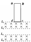 如图所示,在竖直方向上有四条间距均为L=0.5 m的水平虚线L1、L2、L3、L4,在L1L2之间、L3L4之间存在匀强磁场,大小均为1 T,方向垂直于纸面向里。现有一矩形线圈abcd,长度ad=3 L,宽度cd=L,质量为0.1 kg,电阻为1Ω,将其从图示位置静止释放(cd边与L1重合),cd边经过磁场边界线L3时恰好做匀速直线运动,整个运动过程中线圈平面始终处于竖直方向,cd边水平。(g=10 m/s2)则( )