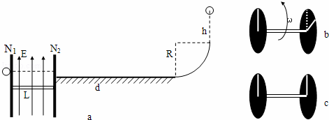 如图(a)所示,左侧为某课外活动小组设计的某种速度选择装置(图b为它的立体图),由水平转轴及两个薄盘N1、N2构成,两盘面平行且与转轴垂直,相距为L=1m,两盘面间存在竖直向上的匀强电场,盘上各开一狭缝,两狭缝夹角可调;右侧为长为d=1m的绝缘水平桌面,水平桌面的右端与一半径为R=0.2m粗糙绝缘的四分之一圆弧相切连接.今有一电荷量为q=8×10﹣6C、质量为m=1kg的一带电小球沿水平方向以v0=4m/s射入N1狭缝,匀速通过两盘间后通过N2的狭缝,并沿水平桌面运动到右端经圆弧后能再上升h=0.2m的高度.已知小球与水平桌面间动摩擦因数为μ=0.2,求: