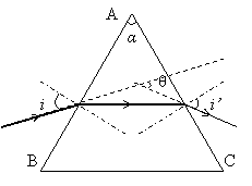 如图所示,一束单色光从空气入射到棱镜的AB面上,经AB和AC两个面折射后从AC面进入空气。当出射角i’ 和入射角i相等时,出射光线相对于入射光线偏转的角度为θ。已知棱镜顶角为α,则计算棱镜对该色光的折射率表达式为