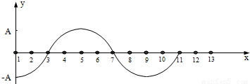 一列横波沿直线向右传播,直线上有间距均为L的13个质点,如下图所示.t=0时横波到达质点1,质点1开始向下运动,振幅为A,经过时间△t,此时质点1第二次到达负向最大位移处,已知该横波的波长为8L,则其波速为    .请在下图中画出t=△t时,此13个质点所形成的波形图.