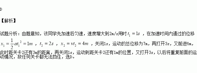 如图所示,某“闯关游戏”的笔直通道上每隔8m设有一个关卡,各关卡同步放行和关闭,放行和关闭的时间分别为3s和1s.关卡刚放行时,一同学立即在关卡1处以加速度2 m/s2由静止加速到2m/s,然后匀速向前,则最先挡住他前进的关卡是( )