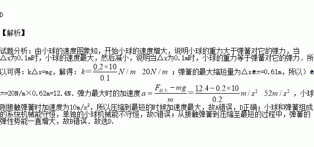 如图甲所示,轻弹簧竖直固定在水平面上.一质量为m=0.2kg的小球,从弹簧上端某高度处自由下落,从它接触弹簧到弹簧压缩至最短的过程中(弹簧在弹性限度内),其速度u和弹簧压缩量△x之间的函数图象如图乙所示,其中A为曲线的最高点.小球和弹簧接触瞬间机械能损失不计,g取10 m/s2,则下列说法正确的是( )