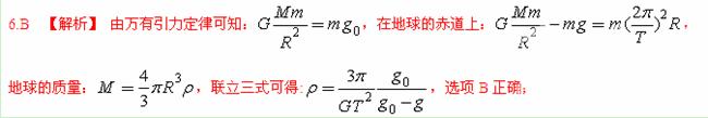 假设地球可视为质量均匀分布的球体,已知地球表面的重力加速度在两极的大小为g0,在赤道的大小为g;地球自转的周期为T,引力常数为G,则地球的密度为: