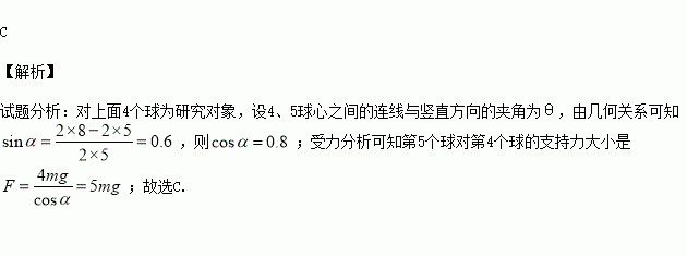 一个很高的容器内壁为圆柱形,里面装有n个质量均为m、大小相同的小球,容器的内半径与小球的半径之比为8:5,如图所示,现将小球从上至下依次编号为1、2、3、… n,不计一切摩擦,重力加速度设为g,则第4个小球对第5个小球的压力大小为
