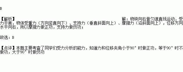 质量为m的小物块在倾角为α的斜面上处于静止状态,如图所示.若斜面体和小物块一起以速度v沿水平方向向右做匀速直线运动,通过一段位移s.斜面体对物块的摩擦力和支持力的做功情况是( )