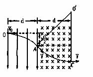如图所示,匀强电场区域和匀强磁场区域是紧邻的且宽度相等均为d,电场方向在纸面内竖直向下,而磁场方向垂直纸面向里。一带正电粒子(重力不计)从0点以速度V0沿垂直电场方向进入电场,从A点射出电场进入磁场,离开电场时带电粒子在电场方向的偏转位移为电场宽度的一半,当粒子从磁场右边界上C点穿出磁场时速度方向与进入电场0点时的速度方向一致,求: