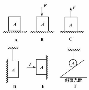 如下图中,物体A的重力均为5 N,加在物体上的力F也均为5 N.在图中各种情况下,物体A对支持面的压力应分别为