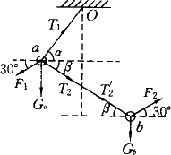 分析:本题考查应用物体的平衡条件处理连接体平衡问题.可用整体法或隔离法进行分析. 方法一:将a、b两球及两球间的绳看作一个物体系统,以这个系统为研究对象.因为作用在a、b上的恒力等大反向,其合外力平衡,而a、b受的重力竖直向下,要保持平衡,故a到悬点的细绳的力必然沿竖直方向向上. 方法二:分别将a、b隔离进行受力分析,分别对a、b两球列出水平分力的平衡方程即可.以选项C为例,受力如图所示. 对a:水平方向有F1cos30°=T1cosα+T2cosβ 对b:水平方向有F2cos30°= 因为F1=F2、T2= |