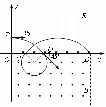 的直线.磁场方向垂直纸面向外.一质量为m、带电量为q的正粒子从y轴上P点以初速度v0垂直y轴射入匀强电场,在电场力作用下从x轴上Q点以与x轴正方向45°角进入匀强磁场.已知OQ=l,不计粒子重力.求: