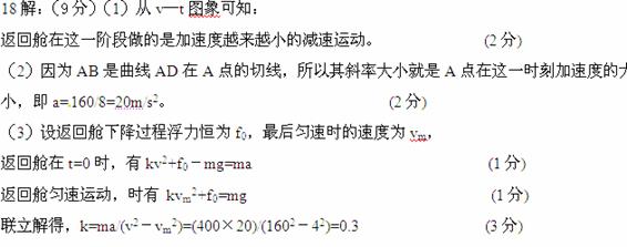 ( 9′)“神舟”五号飞船完成了预定的空间科学和技术实验任务后返回舱开始从太空向地球表面按预定轨道返回,返回舱开始时通过自身制动发动机进行调控减速下降,穿越大气层后,在一定的高度打开阻力降落伞进一步减速下落,这一过程中若返回舱所受空气摩擦阻力与速度的平方成正比,比例系数(空气阻力系数)为k,所受空气浮力恒定不变,且认为竖直降落。从某时刻开始计时,返回舱的运动v—t图象如图2-7中的AD曲线所示,图中AB是曲线在A点的切线,切线交于横轴一点B,其坐标为(8,0),CD是曲线AD的渐进线,假如返回舱总质量为M=400kg,g=10m/s2,求