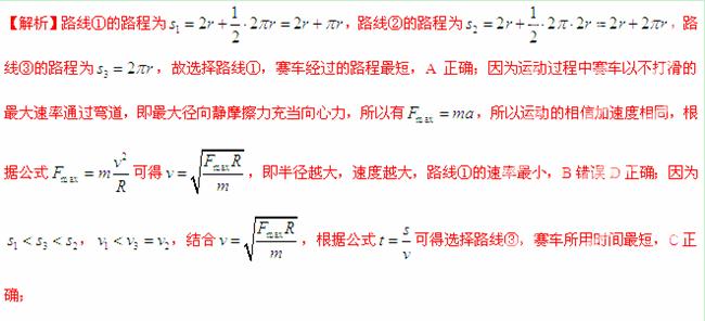 。选择路线,赛车以不打滑的最大速率通过弯道(所选路线内赛车速率不变,发动机功率足够大),则