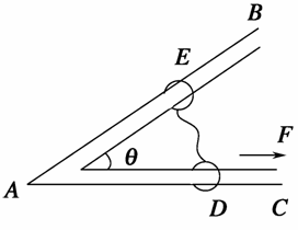 如下图所示,两轻环E和D分别套在光滑杆AB和AC上,AB与AC的夹角为θ,E和D用细线连接,一恒力F沿AC方向拉环D,当两环平衡时,细线与AC间的夹角为________,细线的拉力为________.