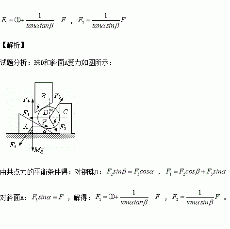 有一种机械装置,叫做“滚珠式力放大器”,其原理如图所示,斜面A可以在光滑水平面上滚动,斜面B以及物体C都是被固定的,它们均由钢材制成,钢珠D置于A.B.C之间,当用水平力F推斜面A时,钢珠D受到物块C.斜面B的压力分别为