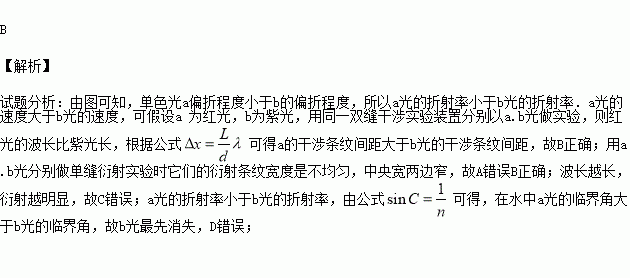 如图所示,两束单色光a.b从水面下射向A点,光线经折射后合成一束光,则正确的是