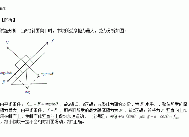D.若将力F竖直向上作用在斜面上,使斜面体竖直向上做匀加速运动,则无论加速度多大,小物块一定不会相对斜面滑动