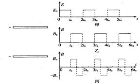 Á½¿é×ã¹»´óµÄƽÐнðÊô¼«°åˮƽ·ÅÖ㬼«°å¼ä¼ÓÓпռä·Ö²¼¾ùÔÈ¡¢´óÐ¡ËæÊ±¼äÖÜÆÚÐԱ仯µÄµç³¡ºÍ´Å³¡£¬±ä»¯¹æÂÉ·Ö±ðÈçͼ¼×¡¢ÒÒËùʾ£¨¹æ¶¨´¹Ö±Ö½ÃæÏòÀïΪ´Å¸ÐӦǿ¶ÈµÄÕý·½Ïò£©¡£ÔÚt=0ʱ¿ÌÓɸº¼«°åÊÍ·ÅÒ»¸ö³õËÙ¶ÈΪÁãµÄ´ø¸ºµçµÄÁ£×Ó£¨²»¼ÆÖØÁ¦£©¡£Èôµç³¡Ç¿¶ÈE0¡¢´Å¸ÐӦǿ¶ÈB0¡¢Á£×ӵıȺÉ