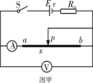 物理学习小组在测定某电源的电动势E和内阻r时,找来一段电阻率较大的粗细均匀的电阻丝ab替代滑动变阻器,设计了如图甲所示的实验,其中R0是阻值为2Ω的保护电阻,滑动片P与电阻丝始终接触良好。实验时闭合开关,调节P的位置,测得aP的长度x和对应的电压U、电流I数据,并分别绘制了如图乙所示的U-I图象和如图丙所示的