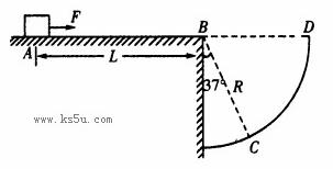 如图所示,水平地面的B点右侧有一圆形挡板。圆的半径R=4m,B为圆心,BC连线与竖直方向夹角为37o.滑块静止在水平地面上的A点,AB间距L=4.5m.现用水平拉力F=18N沿AB方向拉滑块,持续作用一段距离后撤去,滑块恰好落在圆形挡板的C点,已知滑块质量辨=2kg,与水平面间的动摩擦因数