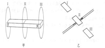 如图所示,甲、乙两图中闭合线圈均匀速从1位置经过II位置移至III位置,情况分别为:甲图中,线圈垂直于s极与N极连线套于条形磁体外部,中心在条形磁体的轴线上,II位置为条形磁体的中央位置;乙图中,线圈在一通电长直导线上方,II位置 为直导线的正上方。请分析以上两种情况中,线圈在通过π位置时,瞬时电流为零的有