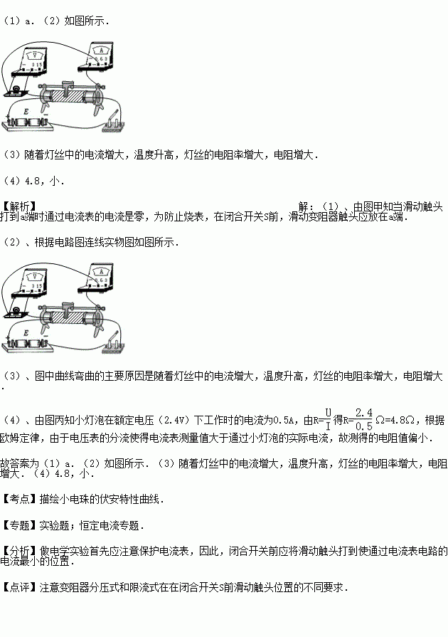 (4)根据所得到的图象如图丙所示,求出它在额定电压(2.4V)下工作时的电阻值R= Ω,这个测量值比真实值偏 .(选填“大”或“小”)