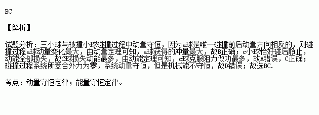 三个完全相同的小球a、b、c以相同的速度分别与另外三个不同的都是静止的小球相碰后,小球a被反向弹回,小球b与被碰球粘合在一起仍沿原方向运动,小球c恰好碰后静止。那么,三种情况比较以下说法中正确的是( )