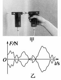 为探究作用力与反作用力的关系,某同学把两只力传感器同时连在计算机上,其中一只系在墙上,另一只握在手中,将两只力传感器的挂钩钩在一起,用力拉一只传感器,如图1甲所示,在计算机显示屏上观察到了这对拉力随时间变化的曲线,如图1乙所示.