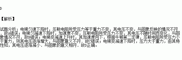 压敏电阻的阻值R随所受压力的增大而减小,某兴趣小组利用压敏电阻设计了判断电梯运动状态的装置,其装置示意图如图甲所示.将压敏电阻平放在电梯内,受压面朝上,在上面放一物体A,电梯静止时电压表示数为Uo,电梯在某次运动过程中,电压表的示数变化情况如图乙所示,下列判断中正确的是