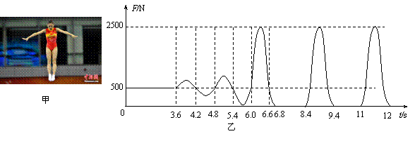 如图甲是2012年我国运动员在伦敦奥运会上蹦床比赛中的一个情景。设这位蹦床运动员仅在竖直方向上运动,运动员的脚在接触蹦床过程中,蹦床对运动员的弹力F随时间t的变化规律通过传感器用计算机绘制出来,如图乙所示。取g= 10m/s2,根据F-t图象分析求解: