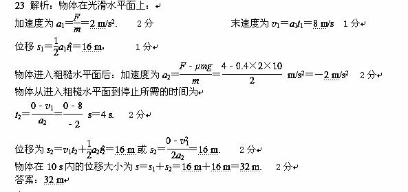 质量为m=2 kg的物体,受到F=4 N的水平恒力作用,先在光滑水平面上由静止开始运动,经4 s后进入动摩擦因数为μ=0.4的粗糙水平面上,又经过了6 s,求该物体10 s内运动的位移大小是多少?