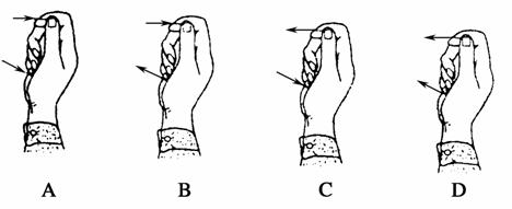 如下图所示,用拇指、食指捏住圆规的一个针脚,另一个有铅笔芯的脚支撑在手掌心位置,使OA水平,然后在外端挂上一些不太重的物品,这时针脚A、B对手指和手掌均有作用力,对这两个作用力方向的判断,下图中大致正确的是( )