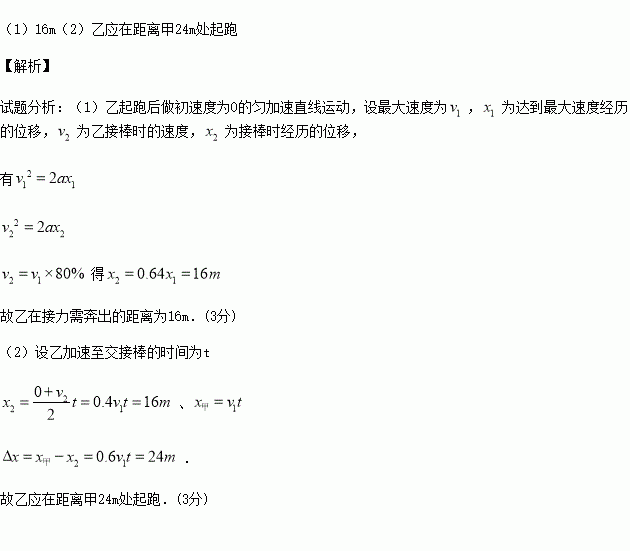 甲、乙两个同学在直跑道上练习4×100m接力跑,如图所示,他们在奔跑时有相同的最大速度.乙从静止开始全力奔跑需跑出25m才能达到最大速度,这一过程可看作匀变速运动.现在甲持棒以最大速度向乙奔来,乙在接力区伺机全力奔出.若要求乙接棒时达到奔跑最大速度的80%,则: