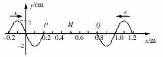 如图所示,两列简谐横波分别沿x轴正方向和负方向传播,两波源分别位于x=-0.2m和x=1.2m处,两列波的速度均为v=0.4 m/s,两波源的振幅均为A=2 cm。图示为 t=0时刻两列波的图像(传播方向如图所示),此刻平衡位置处于x=0.2m和x=0.8m的P、Q两质点刚开始振动。质点M的平衡位置处于x=0.5m处,关于各质点运动情况判断正确的是: