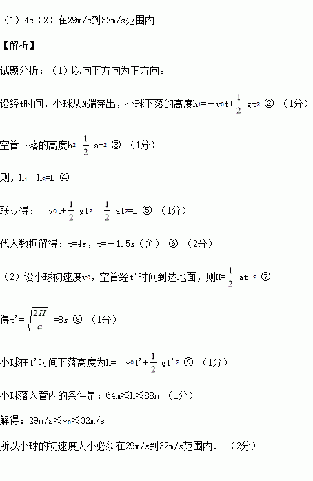 (2)若此空管的N端距离地面64m高,欲使在空管到达地面时小球必须落到管内,在其他条件不变的前提下,求小球的初速度