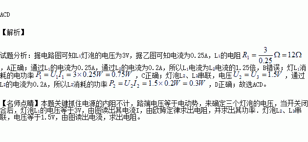 在如图甲所示的电路中,电源电动势为3.0V,内阻不计,L1、L2、L3为3个相同规格的小灯泡,这种小灯泡的伏安特性曲线如图乙所示.当开关闭合后,下列关于电路中的灯泡的判断,正确的是( )