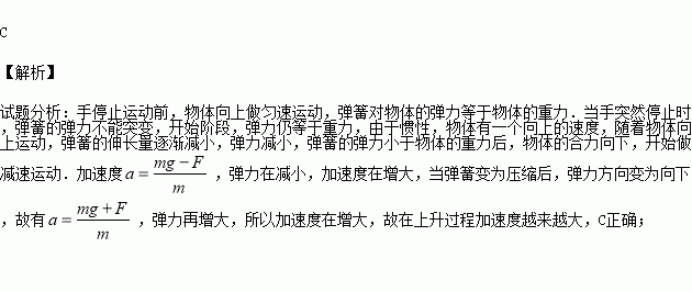 轻质弹簧下端挂一重物,手执弹簧上端使物体向上做匀速运动。当手突然停止以后,重物的运动情况是