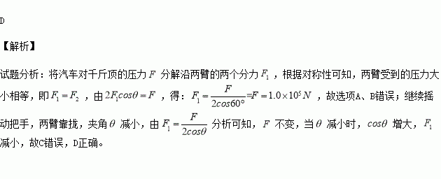 在玉树地震的救援行动中,千斤顶发挥了很大作用,如题图所示是剪式千斤顶,当摇动把手时,螺纹轴就能迫使千斤顶的两臂靠拢,从而将汽车顶起。当车轮刚被顶起时汽车对千斤顶的压力为1.0×105N,此时千斤顶两臂间的夹角为120°,则下列判断正确的是