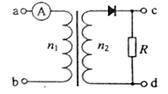 如图,一理想变压器原、副线圈的匝数之比n1:n2=10:1 。原线圈通过一理想电流表A接正弦交流电源,一个二极管和阻值为R的负载电阻串联后接到副线圈的两端;假设该二极管的正向电阻为零相当于导线,反向电阻为无穷大相当于断路;a、b间输入交流电瞬时值的表达式为
