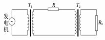 一台发电机通过升压变压器T1和降压变压器T2向用户供电,如图所示,已知输电线的总电阻R=20 Ω,降压变压器T2的原、副线圈匝数之比为5∶1,副线圈与用电器R0组成闭合电路,R0=22Ω。若T1、T2均为理想变压器,T2的副线圈两端电压u=220