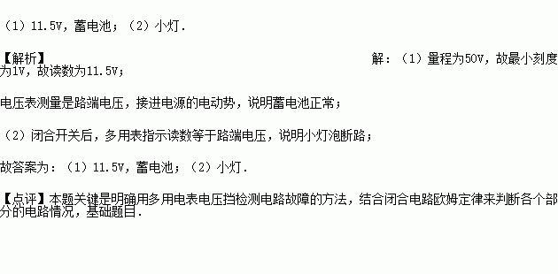 (1)断开开关,红表笔接在a点时多用表指示如图2所示,读数为 V,说明 正常(选填:蓄电池、保险丝、开关、小灯).