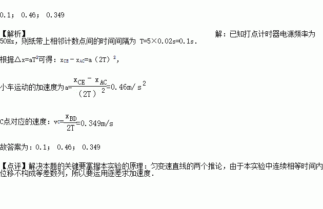 如图所示是实验中打出的一条纸带的一部分,从较清晰的点迹起,在纸带上标出了连续的5个计数点A、B、C、D、E,相邻的两个计数点之间都有4个点迹没标出,测出各计数点之间的距离.已知打点计时器接在频率为50Hz的交流电源两端,则此次实验中AB两计数点间的时间间隔为T= s,小车运动的加速度为a= m/s2,打C点时小车的速度为v= m/s
