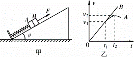 如图所示,平行于光滑斜面的轻弹簧劲度系数为k,一端固定在倾角为θ的斜面底端,另一端与物块A连接,物块B沿斜面叠放在物块A上但不黏连.物块A、B质量均为m,初始时两物块均静止.现用平行于斜面向上的拉力F拉动物块B,使B做加速度为a的匀加速运动,两物块在开始一段时间内的v﹣t图象如图乙所示(t1时刻A、B的图线相切,t2时刻对应A图线的最高点),重力加速度为g,则( )