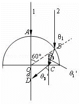 【解析】: 解:(1)光线1通过玻璃砖后不偏折.光线2在圆柱面上的入射角θ1=60°,由折射定律得