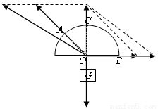 重为G的物体系在两根等长的细绳OA、OB上,轻绳的A端、B端挂在半圆形的支架上,如图所示,OA与水平方向的夹角为45゜,固定B端的位置,将绳OA的A端沿半圆形支架从图示位置开始上移或下移过程中,则
