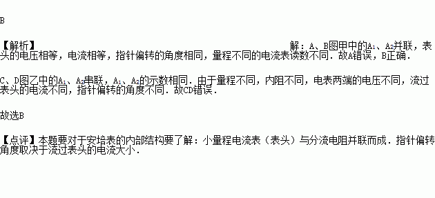 用两个相同的小量程电流表,分别改装成了两个量程不同的大量程电流表A1、A2,若把A1、A2分别采用并联或串联的方式接入电路,如图所示,则闭合电键后,下列有关电表的示数和电表指针偏转角度的说法正确的是( )
