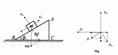 如图所示,质量M=10kg的木楔ABC静止置于粗糙水平地面上,木楔与地面间的动摩擦因数μ=0.02。在木楔的倾角θ为30°的斜面上,有一质量m=10kg的物块由静止开始沿斜面下滑.当滑行路程s=1.4m时,其速度v=1.4m/s.在这过程中木楔始终没有动。求木楔对地面的摩擦力和压力(重力加速度g取10m/s2)。