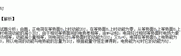 如图,实线为电场线,虚线为等势面且相邻两等势面的电势差相等,一正电荷在等势面U3上时具有动能20 J,它运动到等势面U1上时,速度恰好为零,令U2=0,那么,当该电荷的电势能为4 J时,其动能大小为__________J.