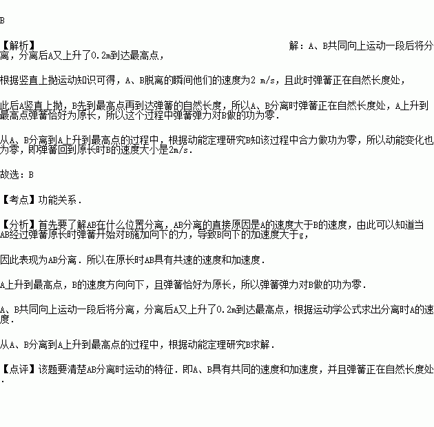 如图所示,竖直放置的轻弹簧上端与质量为3kg的物块B相连接,另一个质量为1kg的物块A放在B上.先向下压A,然后释放,A、B共同向上运动一段后将分离,分离后A又上升了0.2m到达最高点,此时B的速度方向向下,且弹簧恰好为原长.从A、B分离到A上升到最高点的过程中,弹簧弹力对B做的功及弹簧回到原长时B的速度大小分别是(g=10m/s2)( )