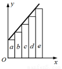 ÔÚ¡°Ì½¾¿Ð¡³µËÙ¶ÈËæÊ±¼ä±ä»¯µÄ¹æÂÉ¡±µÄʵÑéÖУ¬Ð¡³µ×öÔȼÓËÙÖ±ÏßÔ˶¯£¬´òµã¼ÆÊ±Æ÷½ÓÔÚ50HZµÄµÍѹ½»±äµçÔ´ÉÏ¡£Ä³Í¬Ñ§ÔÚ´ò³öµÄÖ½´øÉÏÿ5µãȡһ¸ö¼ÆÊýµã£¬¹²È¡ÁËA¡¢B¡¢C¡¢D¡¢E¡¢FÁù¸ö¼ÆÊýµã£¨Ã¿ÏàÁÚÁ½¸ö¼ÆÊýµã¼äµÄËĸöµãδ»³ö£©¡£´Óÿһ¸ö¼ÆÊýµã´¦½«Ö½´ø¼ô¿ª·Ö³ÉÎå¶Î£¨·Ö±ðΪa¡¢b¡¢c¡¢d¡¢e¶Î£©£¬½«ÕâÎå¶ÎÖ½´øÓɶ̵½³¤½ô¿¿µ«²»ÖصþµØÕ³ÔÚxoy×ø±êϵÖУ¬ÈçͼËùʾ£¬ÓÉ´Ë¿ÉÒԵõ½Ò»Ìõ±íʾv-t¹ØÏµµÄͼÏߣ¬´Ó¶øÇó³ö¼ÓËٶȵĴóС¡£