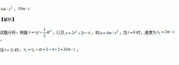 质点在x轴上运动,其位置坐标x随时间t的变化关系为x=2t2+2t-4,则其加速度a=______m/s2。当t=2时,速度为___________m/s(x的单位是m,t的单位是s)。